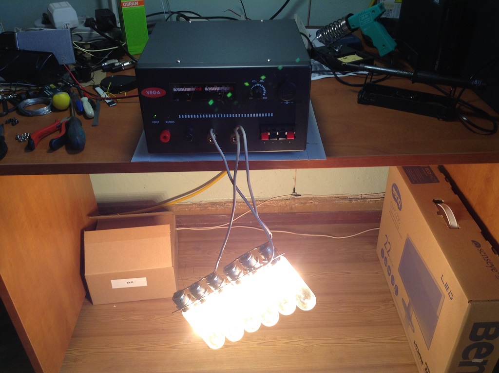 Блок питания выдержал и полдня работал без заметного нагрева. Два вентилятора в корпусе при этом работали в полную силу и производили не слишком сильный, но заметный шум. Тепло, идущее от ламп, было совсем как от электрообогревателя и в комнате заметно потеплело.