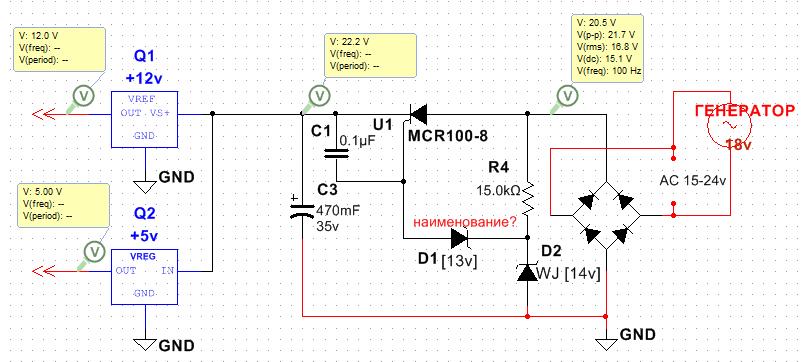 Схема на тиристоре нужна для того, чтобы стабилизаторы запитывались только тогда, когда напряжение с генератора устаканится и достигнет требуемой величины.