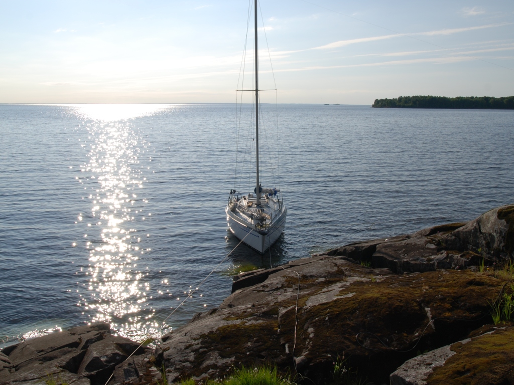 Первая ночёвка была у Ивановских островов, а сейчас мы уже в Кижских шхерах. Проведено довольно много QSO на 20 м диапазоне с трансивера FT-450D, запитанного от аккумулятора 90Ач и с укороченной 2,5 м резонансной штыревой антенной. В первый день прохождение было неважное, поэтому связей провели немного.