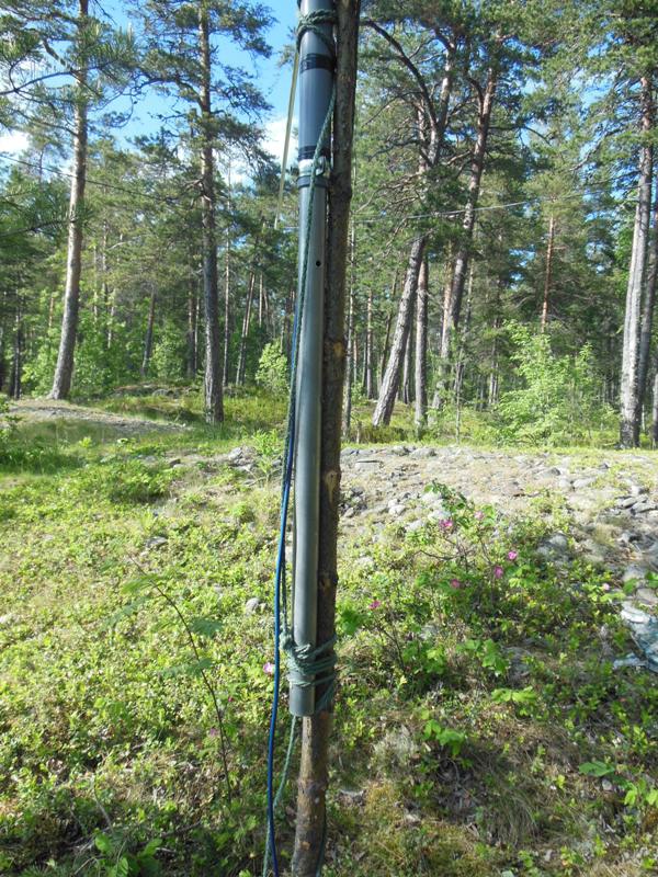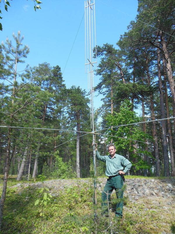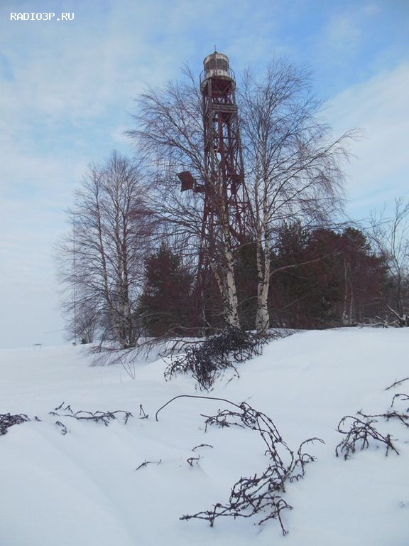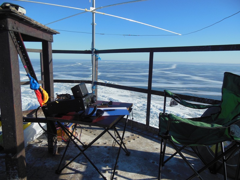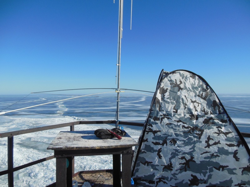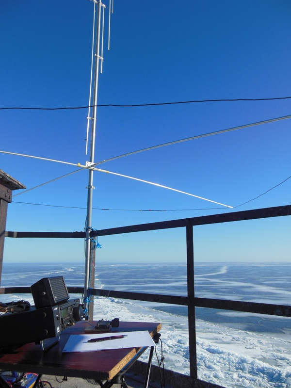 Шурина оттягивает нижнюю часть антенны в сторону от маяка, а я поднимаю антенну за веревку, привязанную к верхнему изолятору антенны. Процедура подъема антенны заняла минут пять. Сначала поднял и положил антенну на ограждения верхней площадки маяка. Отпустил шурина рыбачить. Потом собрал резонансные элементы и установил антенну вертикально, привязав основание к перилам ограждения площадки. Затем вставил трубки рамки и растянул саму рамку - антенна готова к работе.