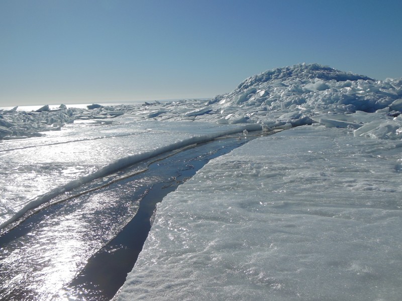 По мере усиления ветра, началась подвижка льда, и трещины начали увеличиваться в размерах.