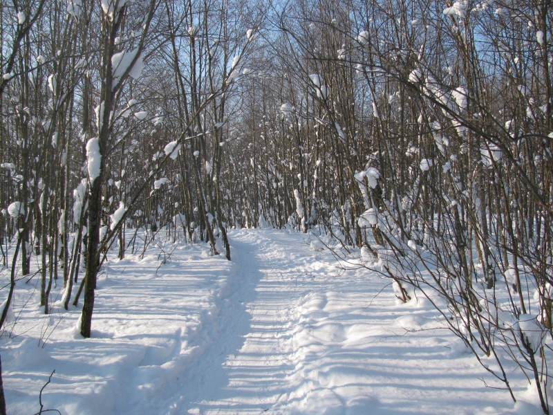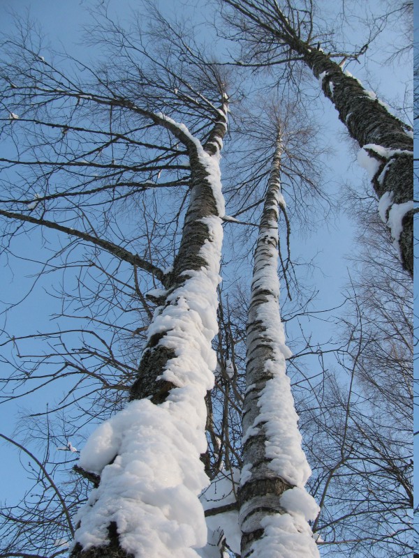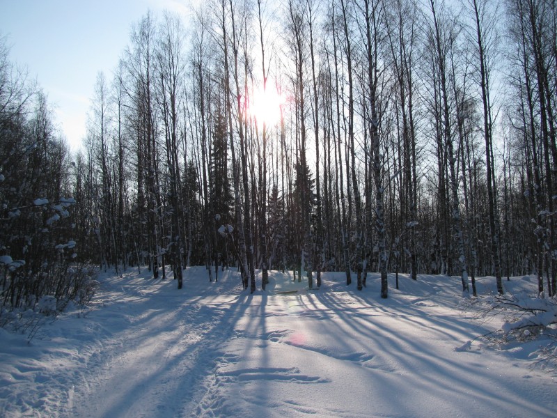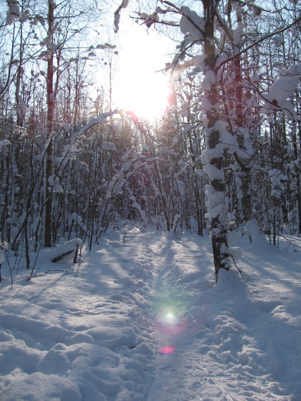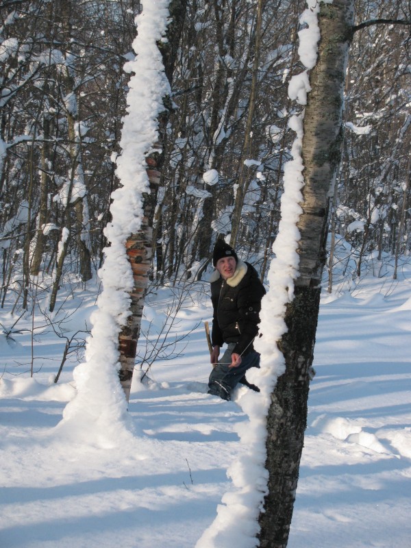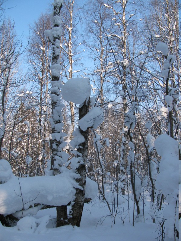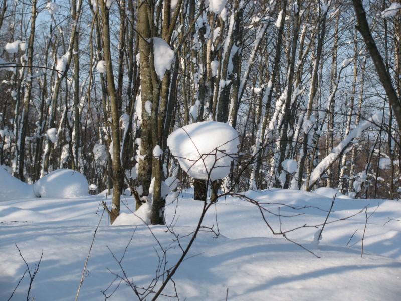 Солнце светило вовсю и красота в лесу была несказанная. Каждый пенёк был снабжён внушительной снежной шапкой и на ветвях деревьев красовались внушительные снежные образования причудливой формы.