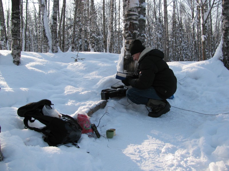 Других сложностей с установкой антенны и организацией рабочего места не возникло. Как обычно трансивер FT-817ND был подключен к гелевому аккумулятору ёмкостью 4,5 Ач. На индикаторе трансивера совсем не было видно обратной волны, то ли антенна очень удачно согласовалась, то ли жидкие кристаллы дисплея подмёрзли. Эфир был чист и прозрачен, как и положено за городом, и работа в эфире началась.