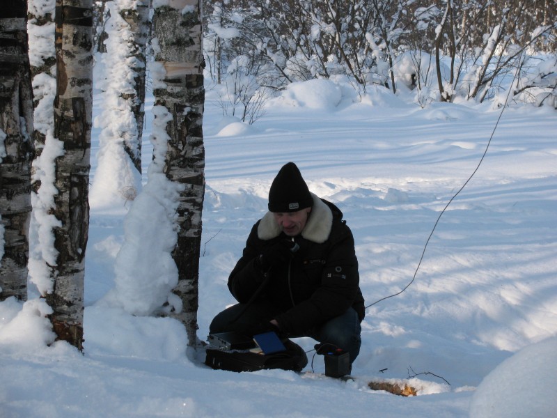 Также иногда приходилось согреваться другим способом, то есть бегать в разных направлениях и прыгать на месте, мороз-то был очень неслабый. Аппарат работал просто на удивление, совершенно нормально, хотя корпус вряд ли был намного теплее воздуха, снег на трансивере не таял. Работа антенны мне также очень понравилась, корреспонденты отмечали, что они слышали меня довольно неплохо для 5 ваттной станции. После QSO в 11:17 UTC с UU0AK из Феодосии (Александр слышал меня на 57) решили сворачивать аппаратуру и выдвигаться в обратном направлении, мороз давал о себе знать и по времени уже было пора. Быстренько свернули антенну, кабель и трансивер, и быстрым шагом пошли в город. На этом наша миниэкспедиция закончилась, а заряд бодрости и хорошего настроения остался.