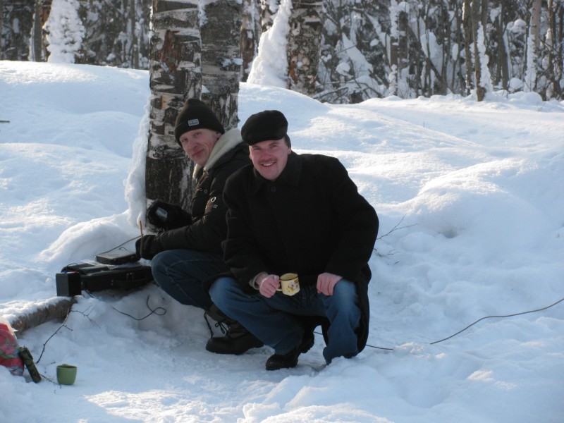 На 23 февраля прогноз погоды обещал морозный день, около -20 С, но желание подышать свежим воздухом оказалось сильней. Был вариант поддержать почин радиолюбительской общественности и пойти на о. Неглинный, но вспоминая прогулку по льду Онежского озера в прошлое воскресенье, особого энтузиазма в этом направлении у меня не было. Поэтому было решено пойти в лес, где ветер должен быть не такой сильный, как на просторах снежного Онего. В качестве конечного пункта была выбрана полянка в лесу к югу от Древлянки. Около 11 часов экспедиция в составе двух участников выдвинулась от кольца на Древлянке в южном направлении. В мероприятии принимал участие Александр, с которым мы в своё время работали вместе. Сам он не коротковолновик, но "сочувствует" нашему хобби.