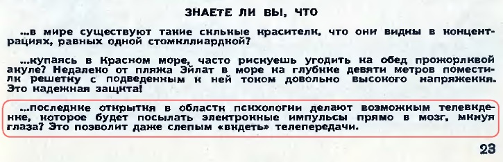Убиться веником, читаю: "концент-рациях"... Заклинило, что за рации такие? Минуты 2 доходило. Опять-же, в солёной морской воде клетка с подведённым высоким напряжением... слабо верится. Ну а про телевидение - если лбом упереться в диполь от парукиловаттного передатчика, то может и можно увидеть картинку, яркую, дугообразную, только совсем недолго.