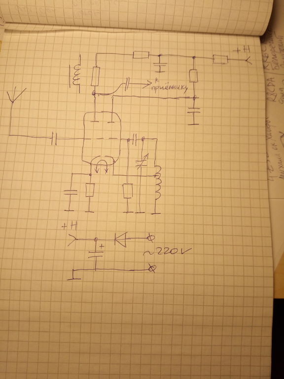 Смотрим схему ( нарисовал по памяти, номиналов не помню ). А где входной контур, скажете вы? А нету, это на гражданке входные контура, а мы стойко переносим тяготы и лишения. Если у вас есть из чего его сделать - велком, только на пользу будет. Но и без него работает. В анодной цепи смесителя неполохо было бы поставить дроссель, если его есть из чего мотать. Если нет - и резистор