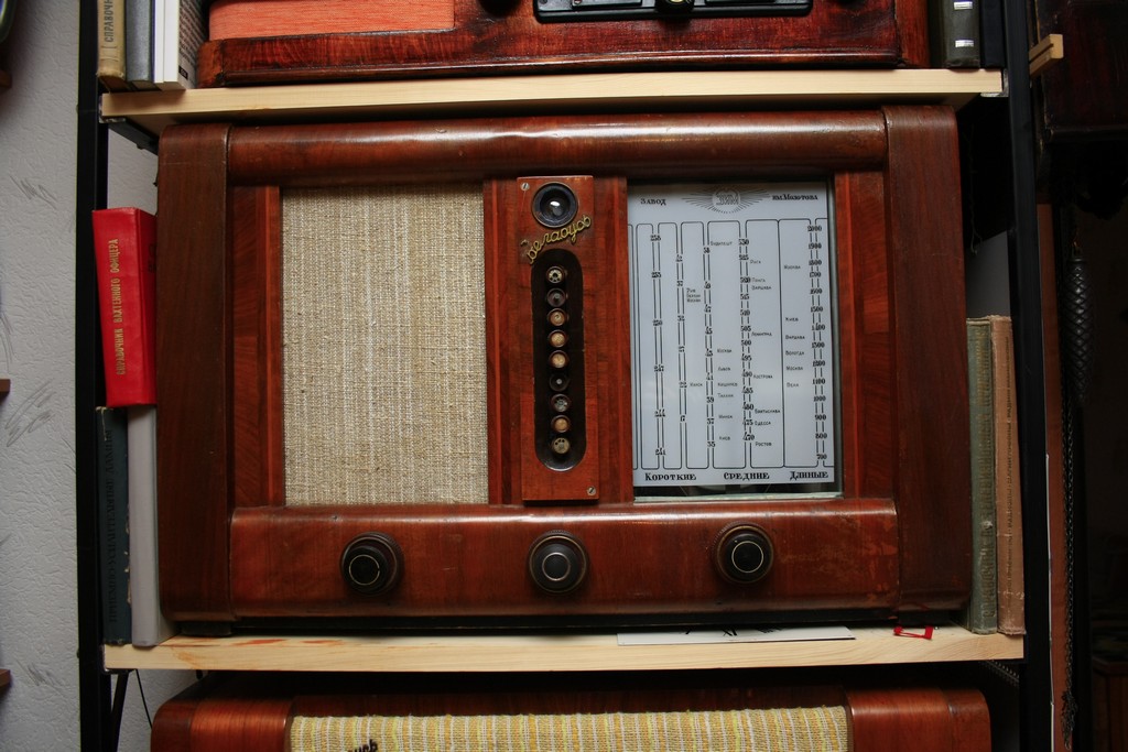 Вот приемник «6Н-1», ламповый, народный, 1936 года выпуска. Тогда Сталин посылал наших радиоинженеров учиться в Америку, потом наши закупили эту поточную линию и стали выпускать приемники в Воронеже. Все аппараты в деревянных корпусах использовались в быту, а в железных — в военных целях.