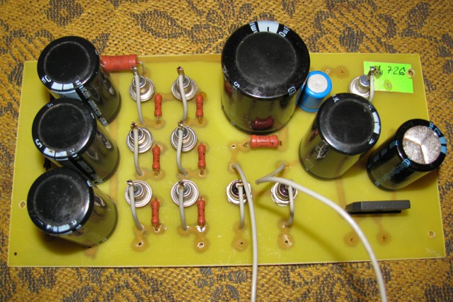 Правда не удержался и на всякий случай добавил стабилизатор напряжения смещения первой сетки оконечного каскада и переключатель сетевого напряжения 220-250В (первичные обмотки трансформатора позволяли проделать такой фокус). Почти все детали разместились на печатной плате, нарисованной спиртовым раствором канифоли и протравленной хлорным железом.