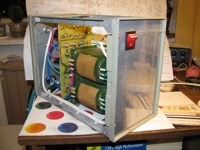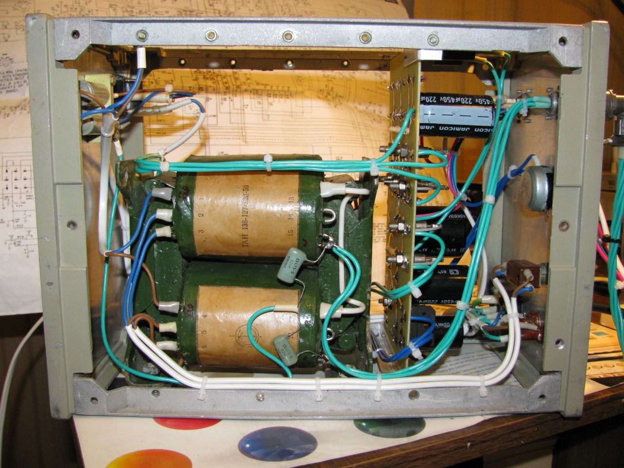 Блок питания даже не стал фотографировать, так как он был весьма страшен на мой взгляд. Сначала взялся за полную переделку блока питания с использованием рамы от корпуса от старого БП (раньше это был какой-то измерительный прибор). Взял анодно-накальный трансформатор и часть электролитических конденсаторов от старой самоделки. В Интернете нашёл описание трансивера и новый БП сделал похожим на "родной" настолько, насколько позволили выходные обмотки трансформатора.