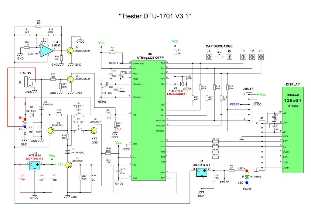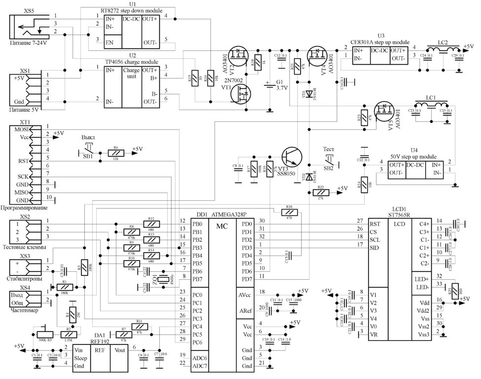 - Типовая схема на ATMEGA328P со свободными портами частотомера и вольтметра, что позволяет собирать для прибора прошивки и и реализовать дополнительный функционал частотомера и измерителя "высоковольтных" стабилитронов.
