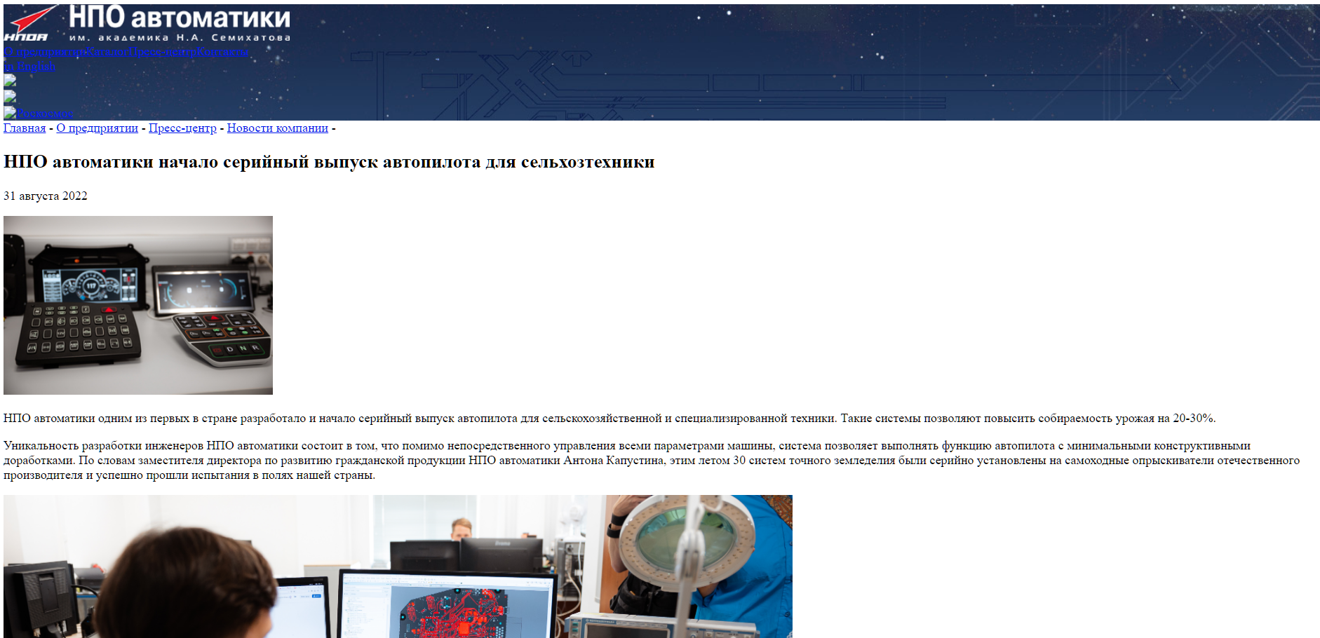 НПО Автоматики (входит в Госкорпорацию «Роскосмос») одним из первых в стране разработало и начало серийный выпуск автопилота для сельскохозяйственной и специализированной техники. Такие системы позволяют повысить собираемость урожая на 20-30%.