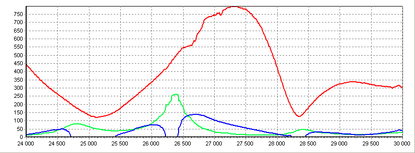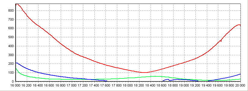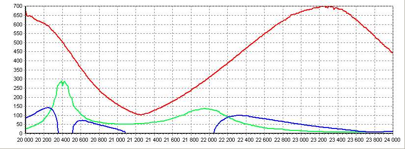 Эти графики получены с помощью антенного анализатора AA-330M ещё до подстройки размеров антенны. Хорошо видно где антенна не попала в диапазоны (красная линия - КСВ).