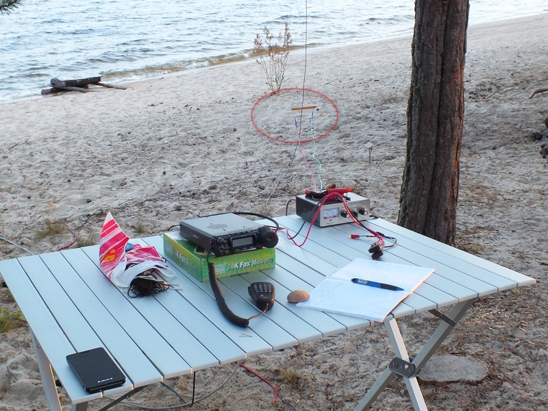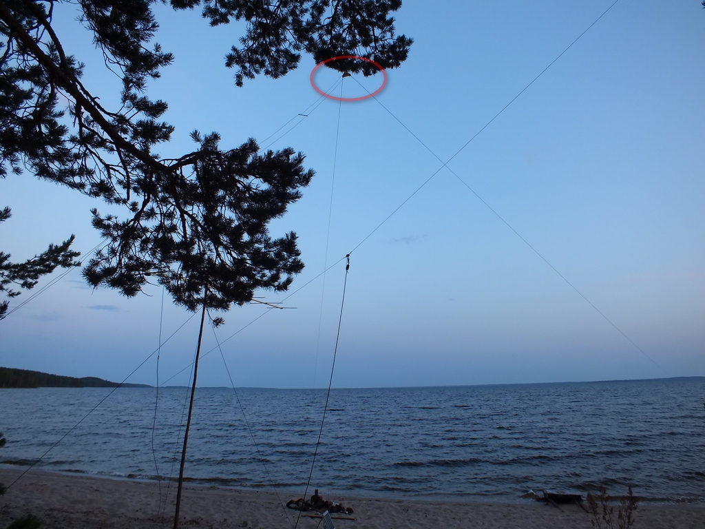 В этом году во время вылазки на Чёлмужскую косу я попробовал подвесить антенну, весьма похожую на V-beam (без нагрузочных резисторов на концах лучей). Взял два куска "полёвки" длиной более 40 метров (сколько было точно даже не знаю). Проблему с местом для подвешивания решил оригинально - натянул провода прямо над водой Онежского озера. К концу каждого провода были привязаны верёвки, достаточно длинные чтобы провода оставались над поверхностью воды. К концам верёвок были привязаны довольно тяжёлые камни, которые были размещены прямо на дне (песчаный пляж и глубина там была небольшая). На берегу провода были прикреплены к треугольной пластине из стеклотекстолита, поднятой посредством перекидывания верёвки с камнем на сосну. Всю эту конструкцию я подключил к ручному антенному тюнеру MFJ-971 со встроенным "балуном" двухпроводной линией, сделанной из многожильного монтажного провода с распорками из того же стеклотекстолита. Угол между проводами получился довольно острый и составлял около 60 градусов.