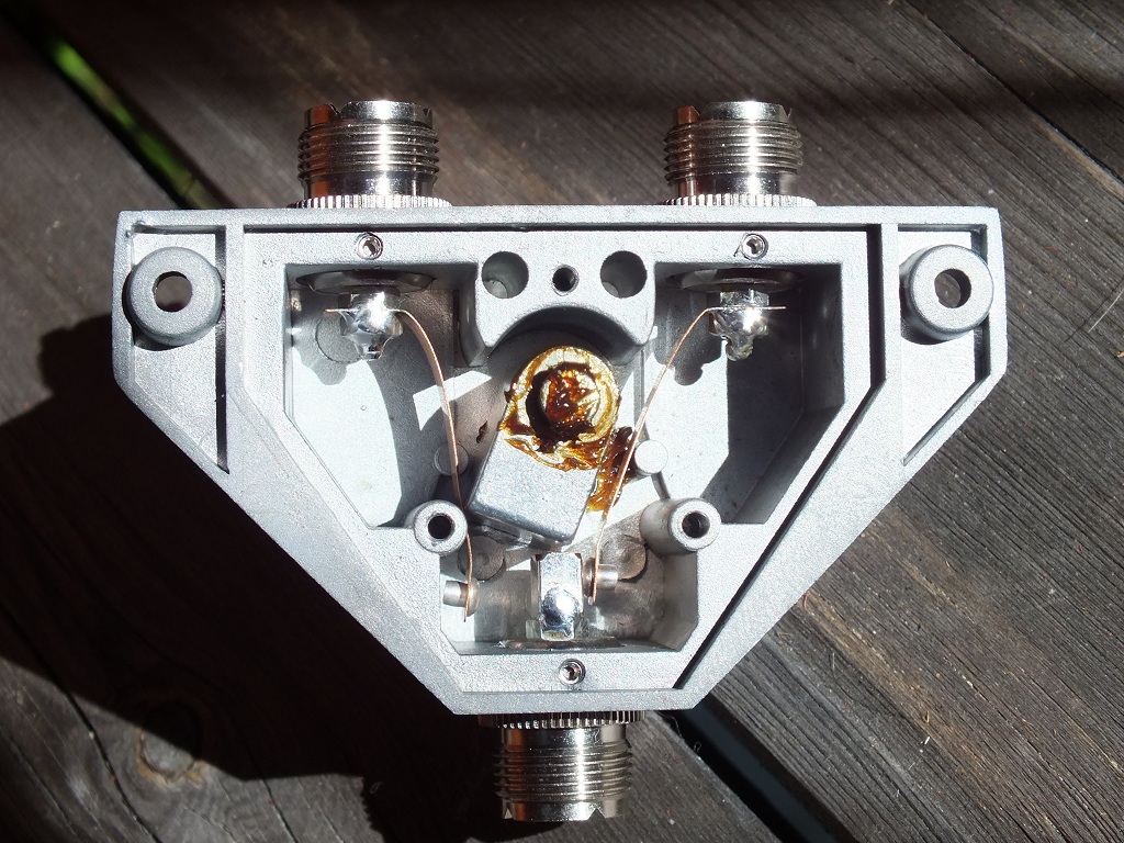 Выявил существенный недостаток коммутатора - сильное влияние на ВЧ диапазоны. История такова - начал строить антенну на 21 и 28 МГц, для быстроты и простоты выбрал "гамак" (2 эл.проволочные "яги" на 14, 21 и 28МГц). Для настройки взял АА-330 (но при этом поленился сделать короткий кабель для подключения к антенне на рабочей высоте). В итоге - 14 МГц более-менее (КСВ на рабочем месте через коммутатор 1,5-1,7), а 21 и 28 - плохо 2,5 и более и подстройка не помогала. Плюнул и и сделал несимметричную проволочную "яги" - торопился к RDXC. Ситуация повторилась - КСВ более 2. После теста спаял короткий кабель и подключил к антенне - очень удивился, КСВ 1,2 на 21040. Дома - 2,5. Обошёл коммутатор - и снова всё хорошо. Проверил на InvV 80-40-20. Влияние не критично на 80м, чуть хуже на 20м (КСВ вырос с 1,35 до 1,86, частота не ушла), на 40 - с 1,5 до 1,76 минимум ушёл на вверх на 80 кГц. Так что вот, сижу - думаю, что делать?