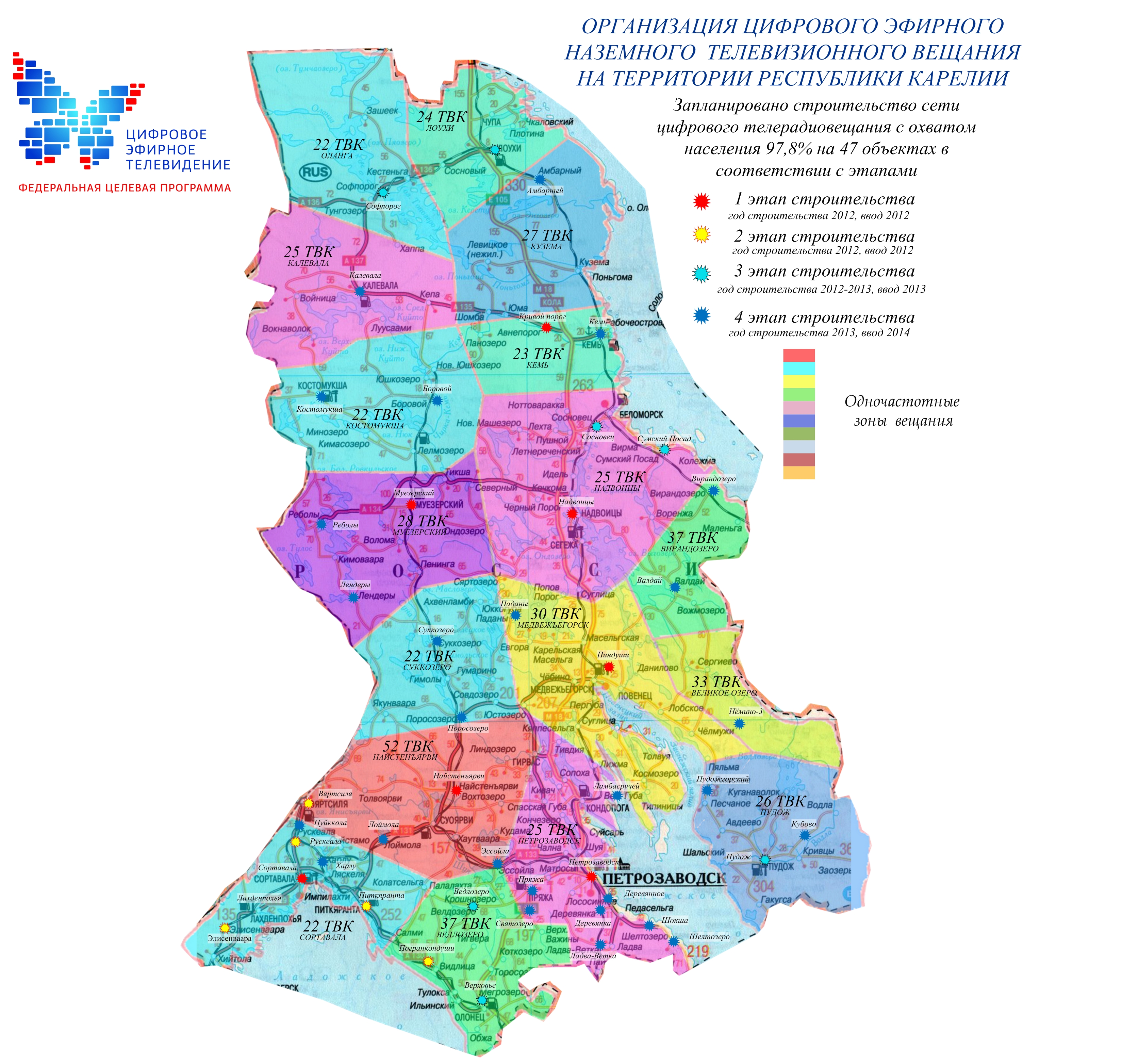 Карта сети цифрового наземного эфирного телерадиовещания филиала РТРС "РТПЦ Республики Карелия"