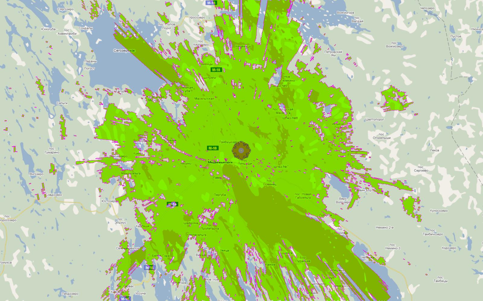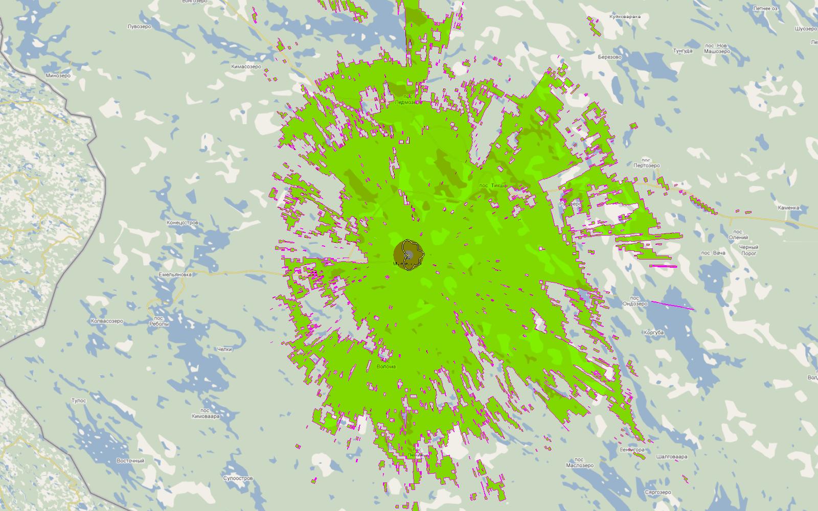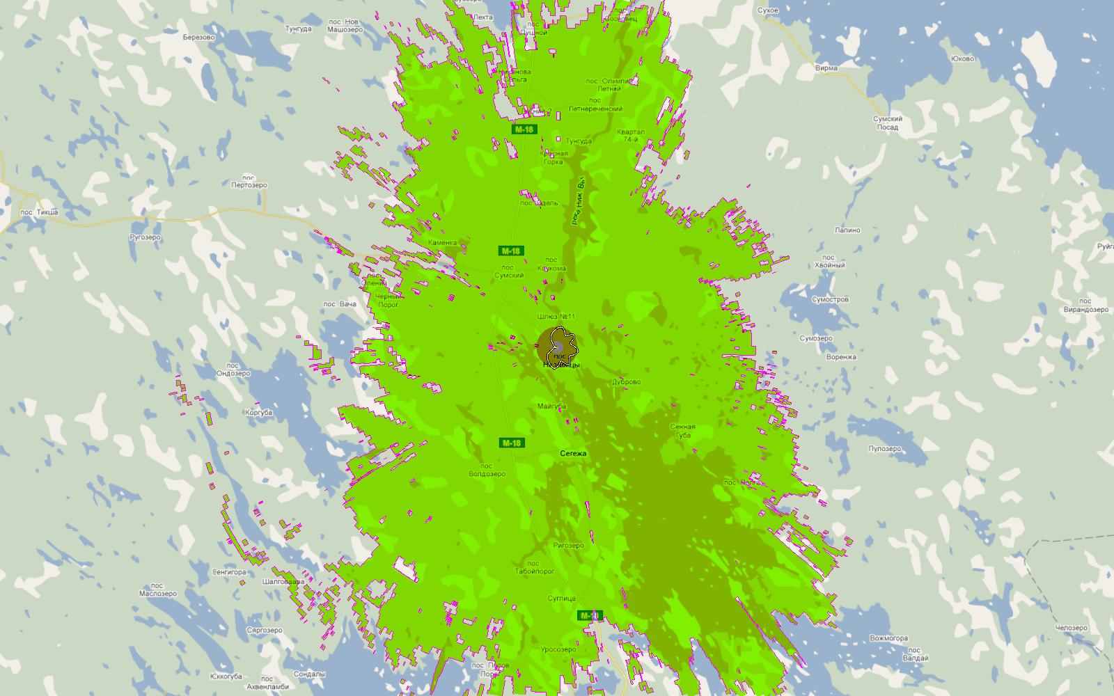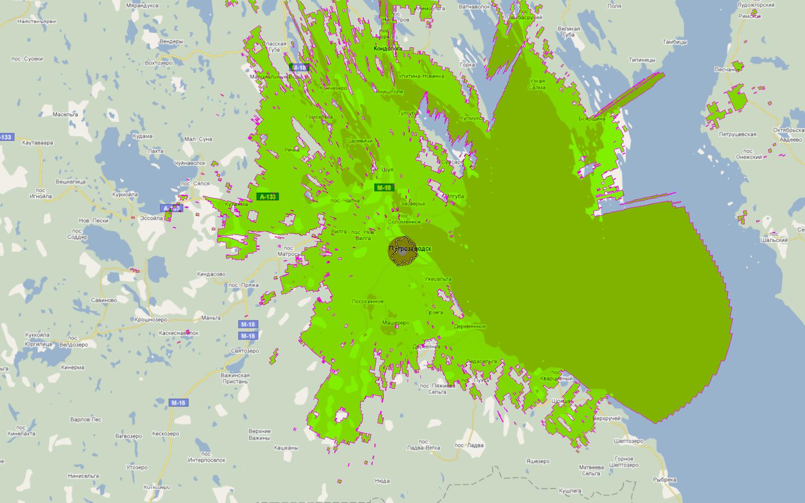 Для примера - зона охвата цифрового передатчика Петрозаводск, 25ВТК (506МГц)