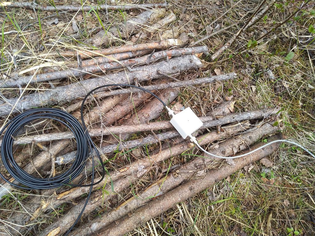 Немного подумал и поднял антенну на сосну классическим способом, используя верёвку с камнем.
