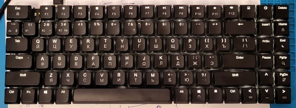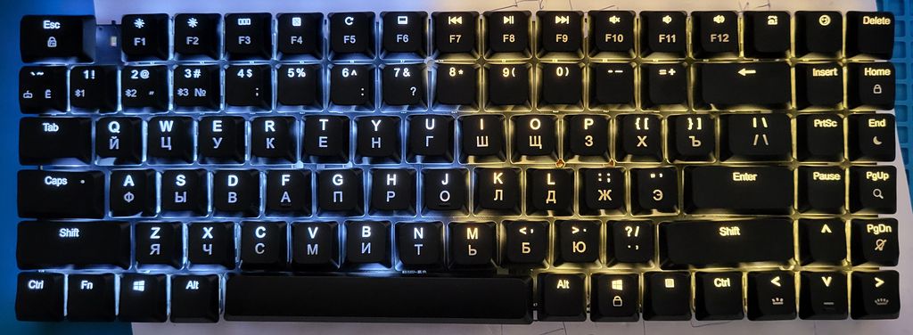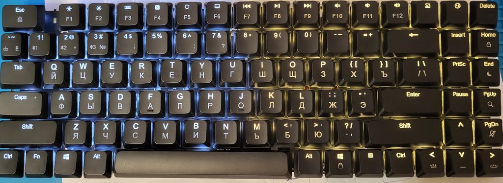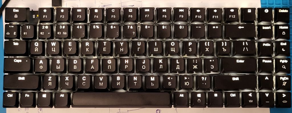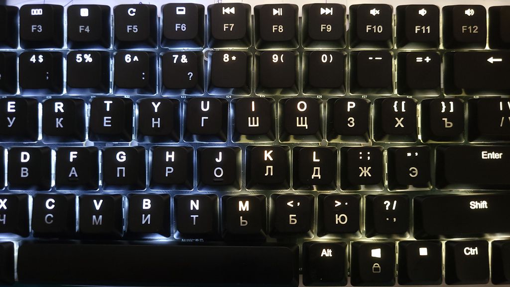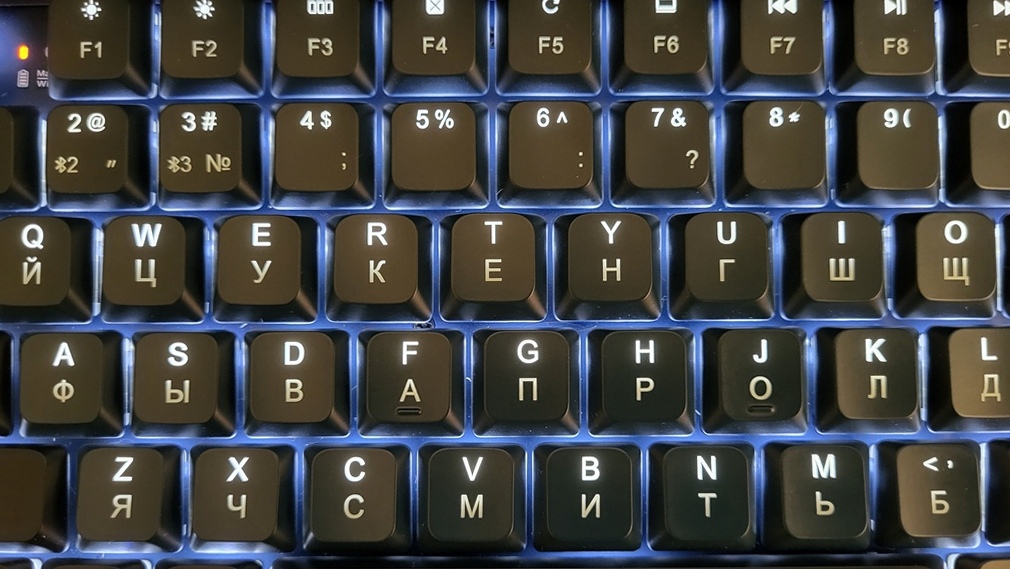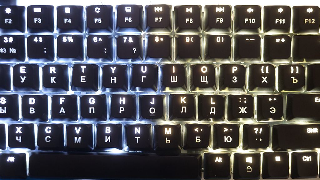 Кириллица заводская. Выполнена крупными символами, расположенными так, чтобы для них хватало подсветки. Это прям топ для для механических клавиатур.