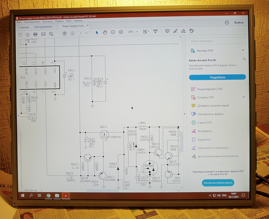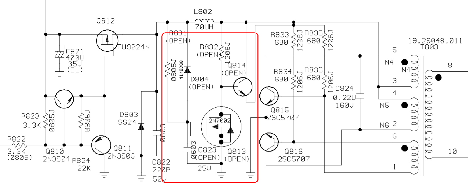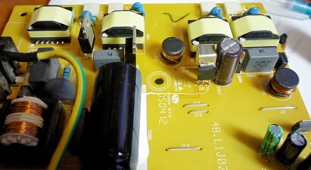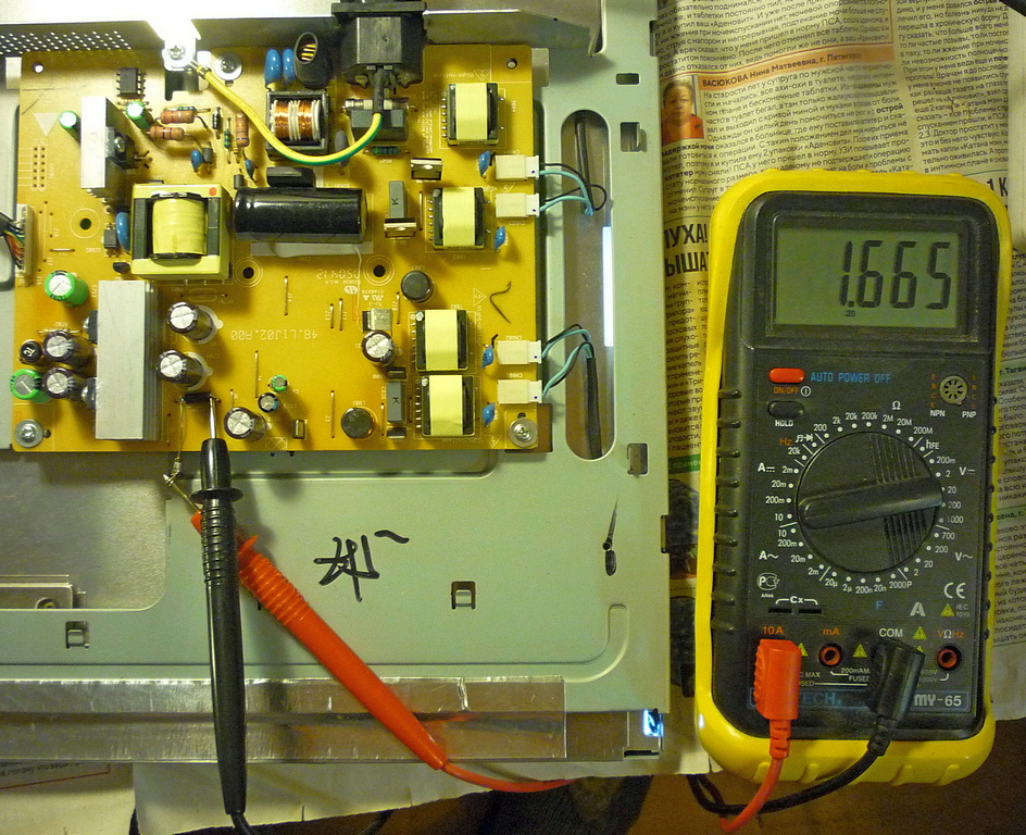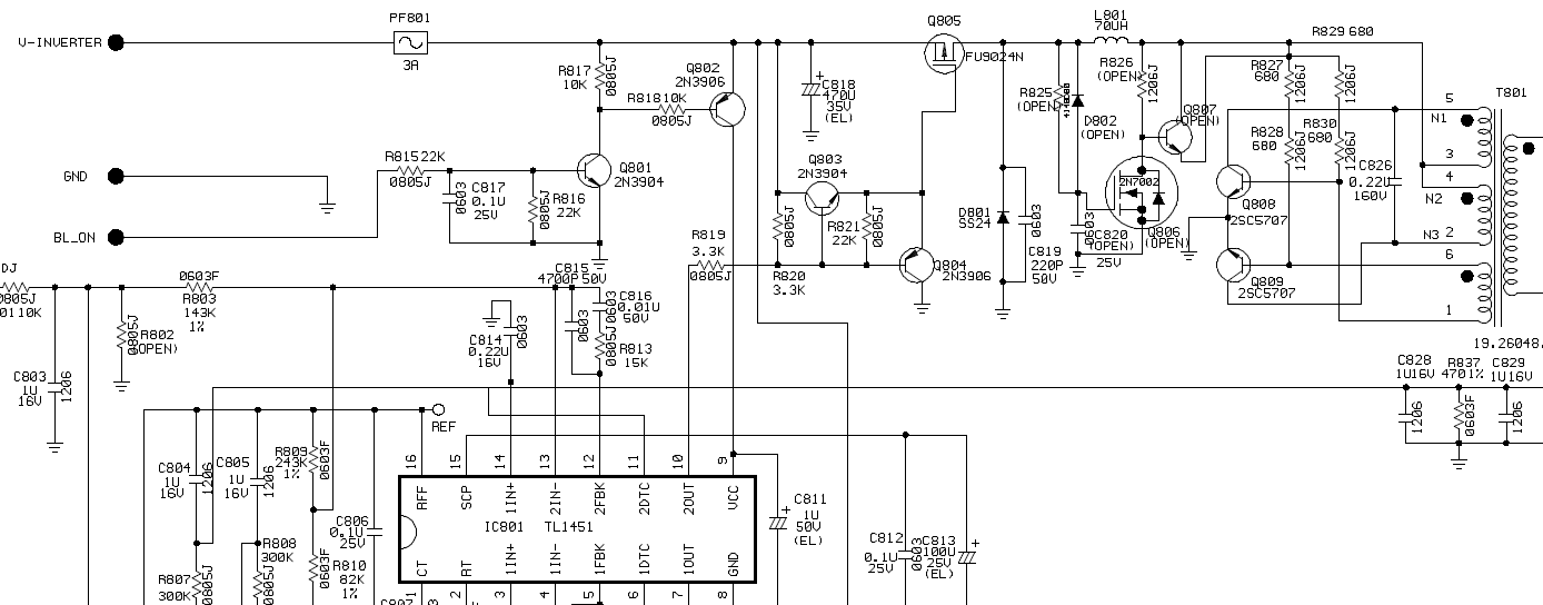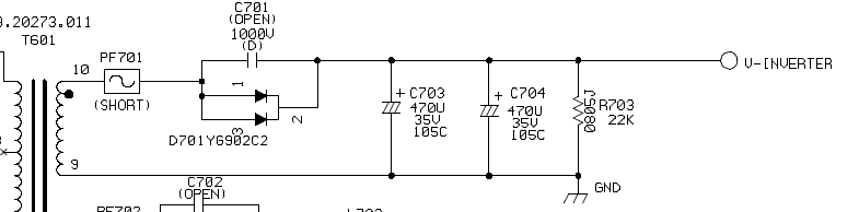Поскольку вся логика этого монитора работает (под определенным углом и освещением даже видно изображение), то интересует в первую очередь цепь V-INVERTER. Проверим предох 701 и напряжение. Судя по напряжению электролитов, оно там не большое.